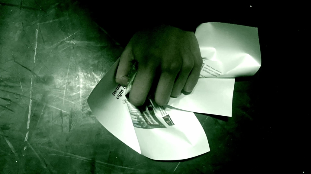 A tole bo vse v enem kadru? … Ali ni to malo na prvo žogo? … One joke film, smo včasih rekli … Aha, menjujejo protagonista … Nekaj o vremenu … Notranji monolog … Nepovezane zgodbe … Ampak niso čisto stereotipne, tale punca, ki se ne more dobit z očetom … Lahko najdemo nekakšno skupno nit? … Še psa so naštimali! … Ampak vsi zvoki so pozneje dodani, splošna atmosfera, pasji cvilež … Mogoče je to zato, da so lahko režirali med snemanjem, ni bilo enostavno vse tole organizirat … Tale pano, ki gre čez kader, je kar natančno kadrirano vse skupaj … A je ta Mojca Dimec res taka faca? Se spomnim, je bila pri Ani Monro … Evo, neka panika, punca pravi, da sliši nek zvok … Aha, čez belo steno gre kamera; na tem mestu so lahko s prelivom zamenjali kader. Tako je delal Hitchcock v Vrvi, ampak on ni mogel drugače, ker filmske role niso bile dovolj velike … Ali so zamenjali kader ali niso? … Aha, zdaj gre pa zgodba iz stranišča nazaj … Tale bejba je pa res polna sama sebe … A se ta mladina res toliko ukvarja s samopodobo? … Mogoče je pa to rdeča nit – umetniška gimnazija, vsi se ukvarjajo samo sami s seboj … Od začetka je bila še neka ljubezen, proti koncu pa vedno bolj mlačni odnosi … Me zanima, ko so igrali, ali so vedeli, kakšne besede jim bodo podtaknili na koncu? Ali pa je vsak govoril lastno besedilo in se delal norca iz samega sebe … Na koncu pa še masovka, pa ta kakofonija glasov … Kako jim je uspelo, da gre vse tako gladko, tole je pa res podvig.